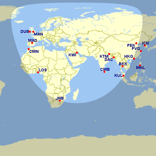 Western Europe + all of SE Asia except Japan nonstop